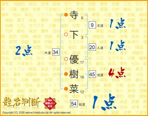 寺(6画)下(3画) 優(17画)樹(16画)菜(12画)