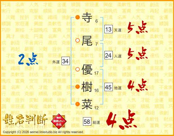 寺尾優樹菜さんの総運は58画の4点!