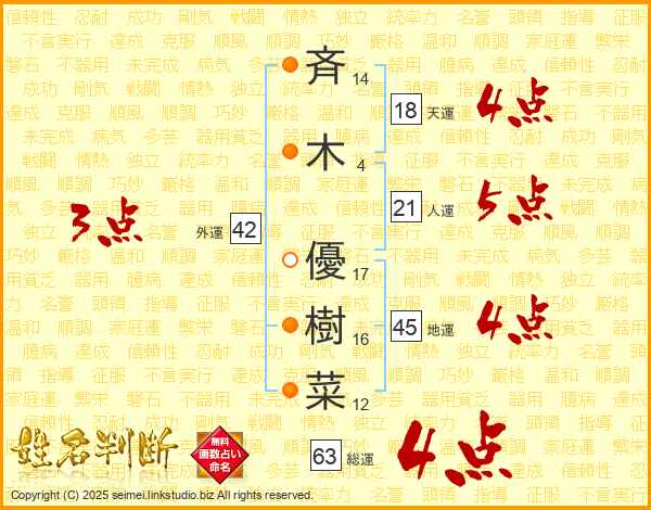 斉(14画)木(4画) 優(17画)樹(16画)菜(12画)