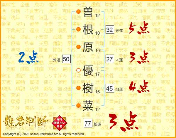 曽(12画)根(10画)原(10画) 優(17画)樹(16画)菜(12画)