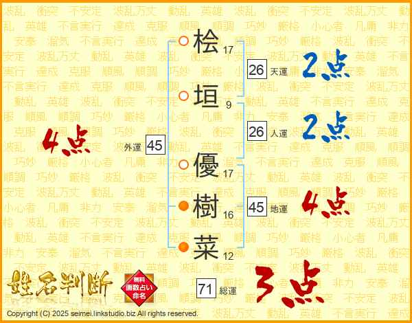 桧(17画)垣(9画) 優(17画)樹(16画)菜(12画)