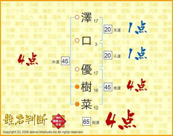 澤(17画)口(3画) 優(17画)樹(16画)菜(12画)
