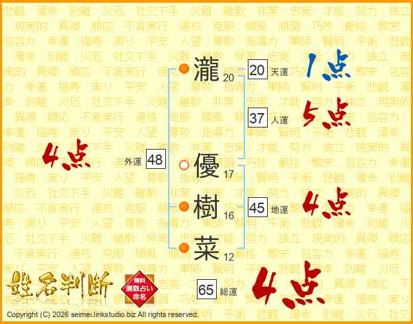 瀧優樹菜さんの総運は65画の4点!