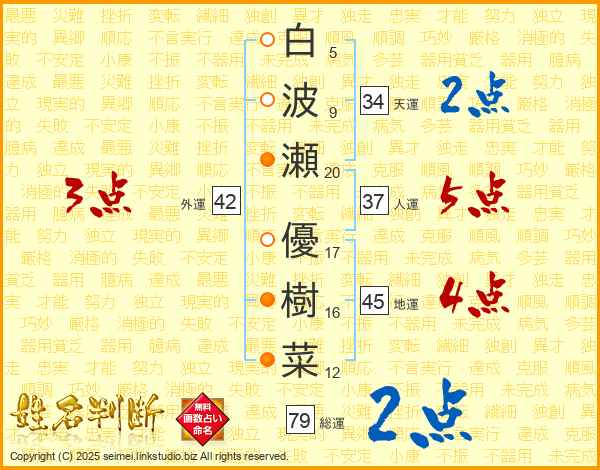 白(5画)波(9画)瀬(20画) 優(17画)樹(16画)菜(12画)
