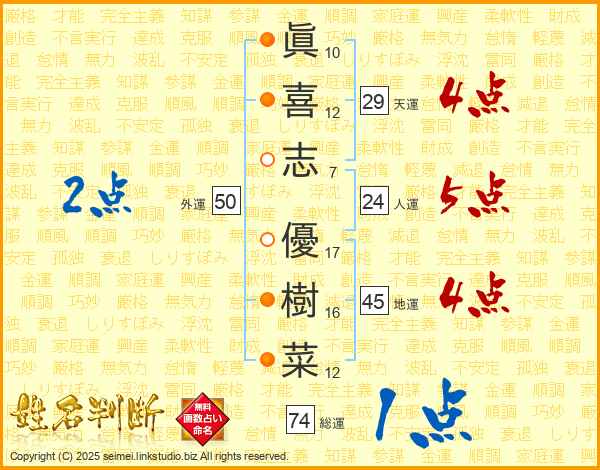 眞喜志優樹菜さんの総運は74画の1点!