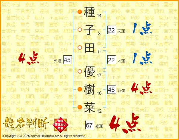 種(14画)子(3画)田(5画) 優(17画)樹(16画)菜(12画)