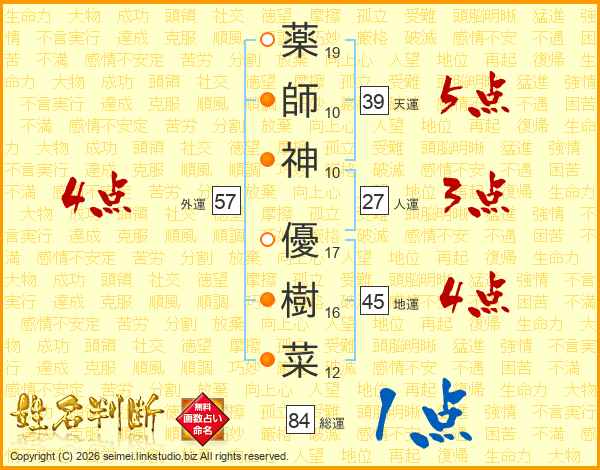 薬(19画)師(10画)神(10画) 優(17画)樹(16画)菜(12画)