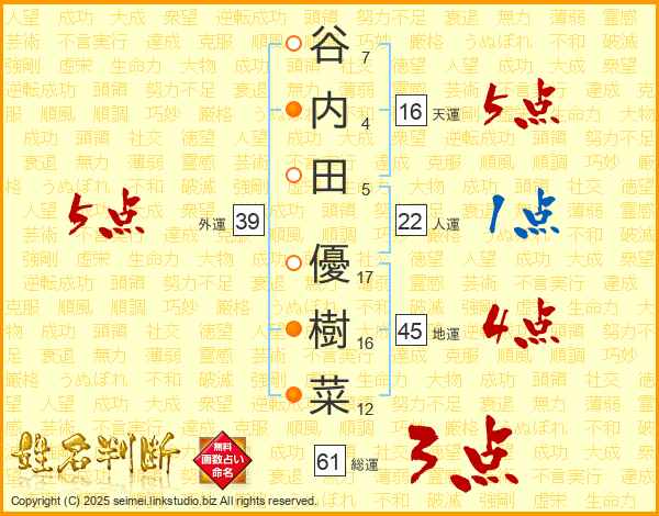 谷(7画)内(4画)田(5画) 優(17画)樹(16画)菜(12画)