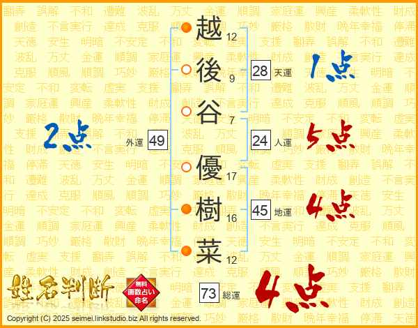 越(12画)後(9画)谷(7画) 優(17画)樹(16画)菜(12画)