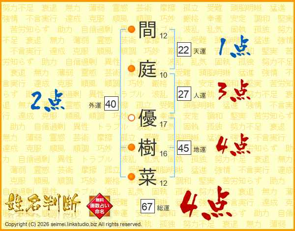 間庭優樹菜さんの総運は67画の4点!