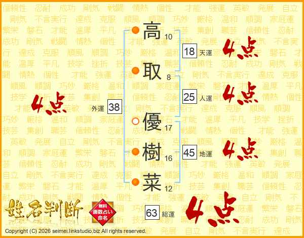 高取優樹菜さんの総運は63画の4点!