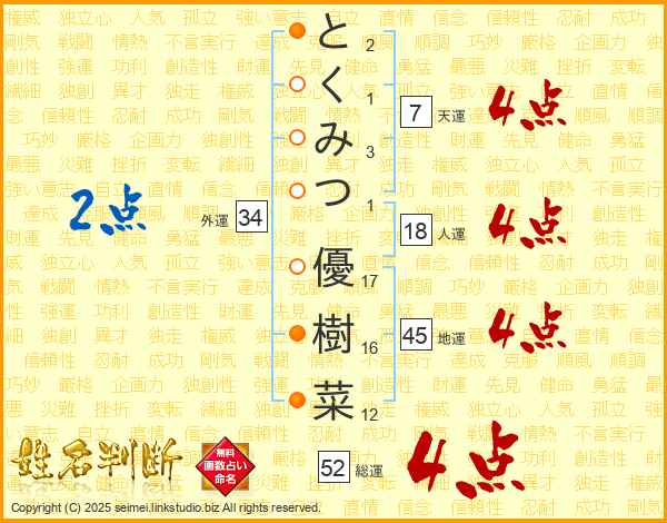 と(2画)く(1画)み(3画)つ(1画) 優(17画)樹(16画)菜(12画)