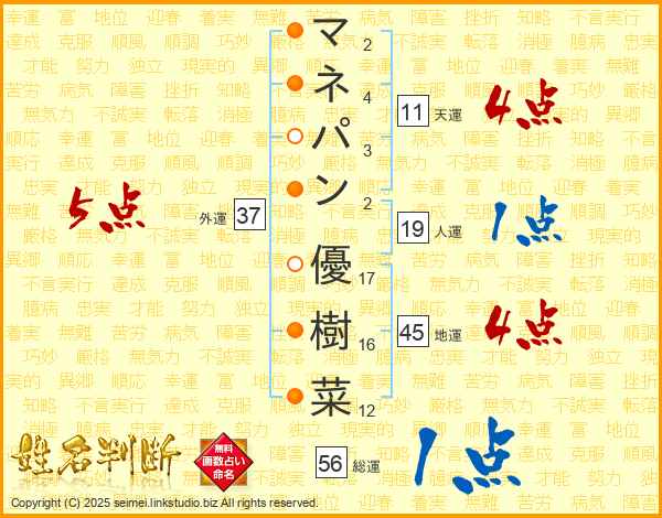 マ(2画)ネ(4画)パ(3画)ン(2画)  優(17画)樹(16画)菜(12画)