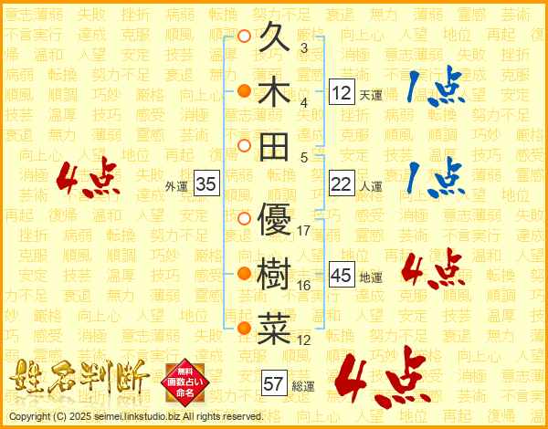 久(3画)木(4画)田(5画) 優(17画)樹(16画)菜(12画)