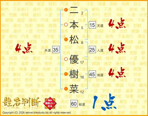 二(2画)本(5画)松(8画) 優(17画)樹(16画)菜(12画)