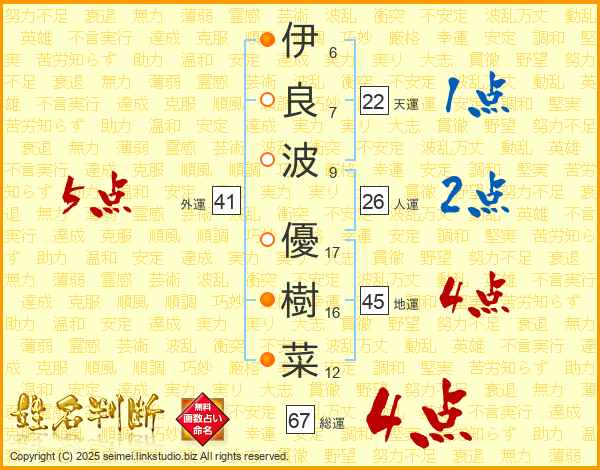 伊(6画)良(7画)波(9画) 優(17画)樹(16画)菜(12画)