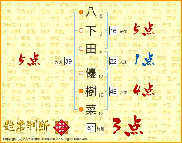 八(8画)下(3画)田(5画) 優(17画)樹(16画)菜(12画)