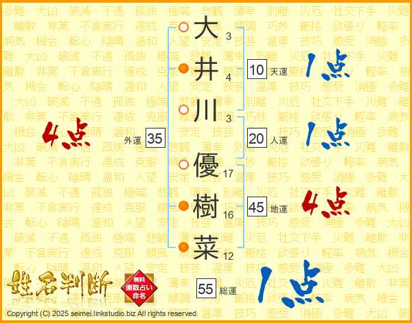 大(3画)井(4画)川(3画) 優(17画)樹(16画)菜(12画)