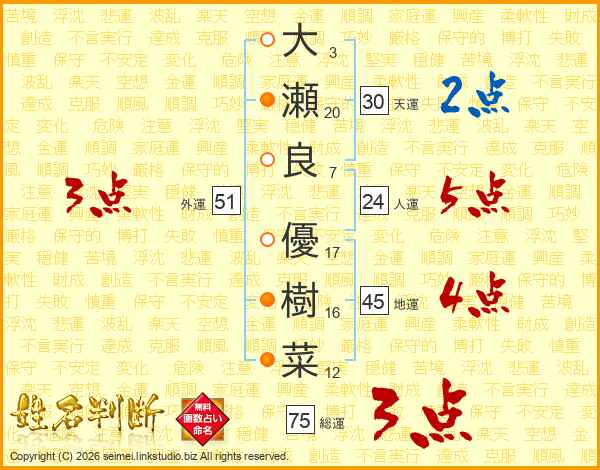 大(3画)瀬(20画)良(7画) 優(17画)樹(16画)菜(12画)