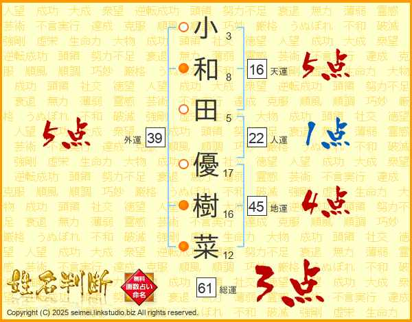 小(3画)和(8画)田(5画) 優(17画)樹(16画)菜(12画)