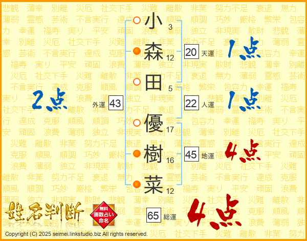 小(3画)森(12画)田(5画) 優(17画)樹(16画)菜(12画)