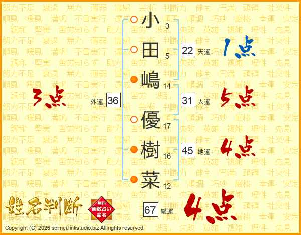 小(3画)田(5画)嶋(14画) 優(17画)樹(16画)菜(12画)