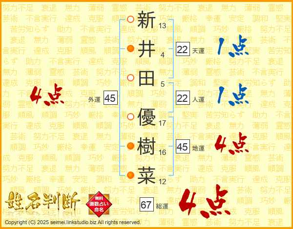 新(13画)井(4画)田(5画) 優(17画)樹(16画)菜(12画)