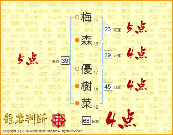 梅(11画)森(12画) 優(17画)樹(16画)菜(12画)