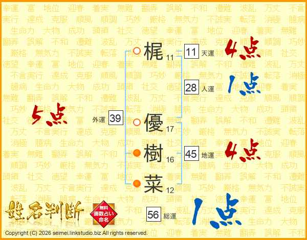梶優樹菜さんの外運は39画の5点!