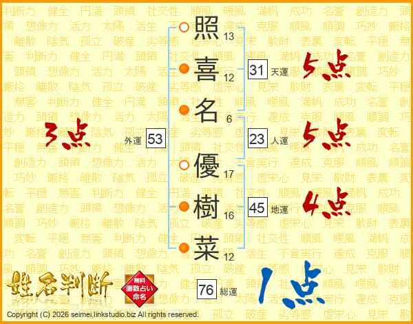照(13画)喜(12画)名(6画) 優(17画)樹(16画)菜(12画)