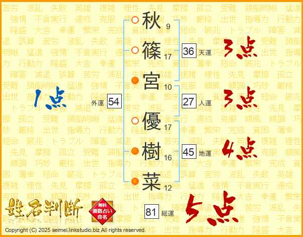 秋(9画)篠(17画)宮(10画) 優(17画)樹(16画)菜(12画)