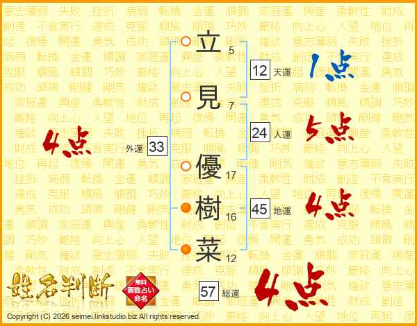 立(5画)見(7画) 優(17画)樹(16画)菜(12画)