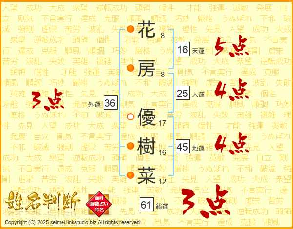 花(8画)房(8画) 優(17画)樹(16画)菜(12画)