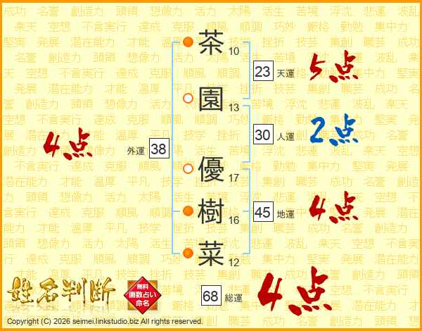 茶(10画)園(13画) 優(17画)樹(16画)菜(12画)
