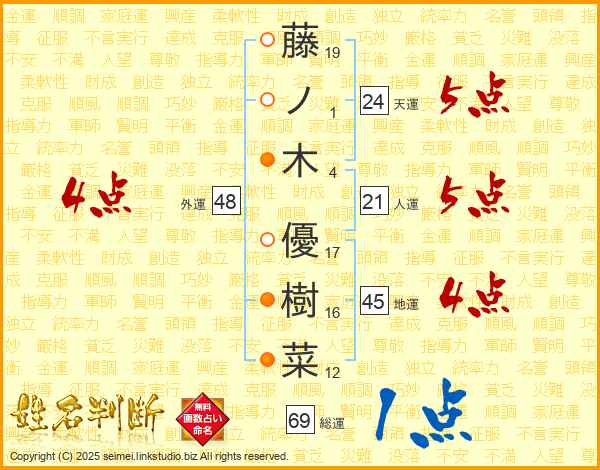 藤(19画)ノ(1画)木(4画) 優(17画)樹(16画)菜(12画)