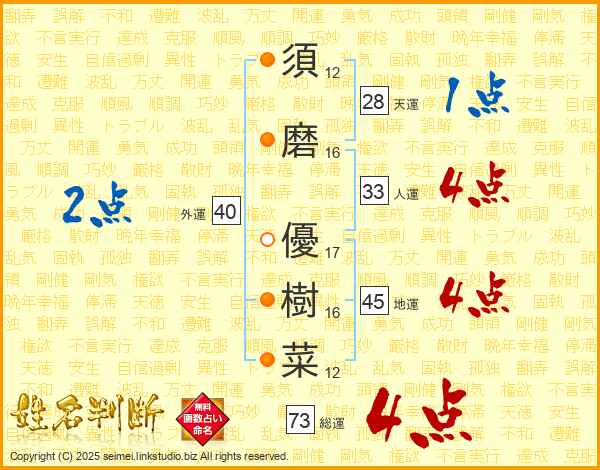 須(12画)磨(16画) 優(17画)樹(16画)菜(12画)