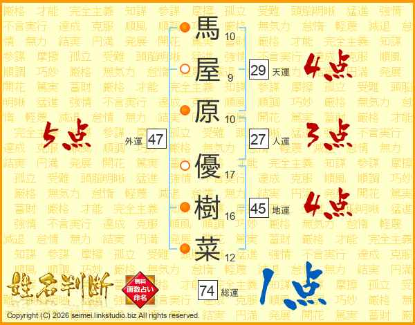 馬(10画)屋(9画)原(10画) 優(17画)樹(16画)菜(12画)