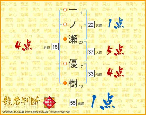 一(1画)ノ(1画)瀬(20画) 優(17画)樹(16画)