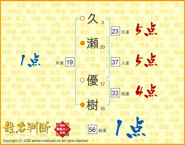 久(3画)瀬(20画) 優(17画)樹(16画)