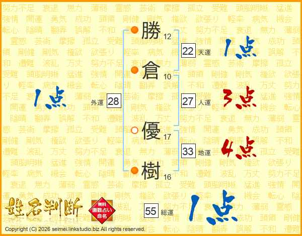 勝(12画)倉(10画) 優(17画)樹(16画)