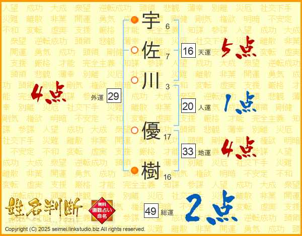 宇(6画)佐(7画)川(3画) 優(17画)樹(16画)