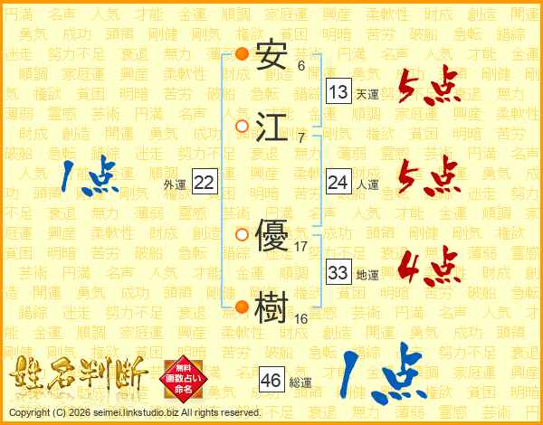 安(6画)江(7画) 優(17画)樹(16画)