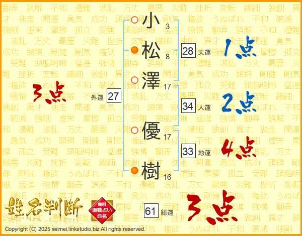 小(3画)松(8画)澤(17画) 優(17画)樹(16画)