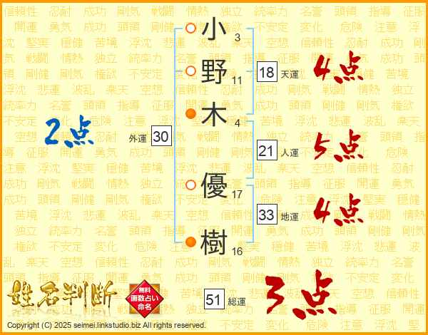 小(3画)野(11画)木(4画) 優(17画)樹(16画)