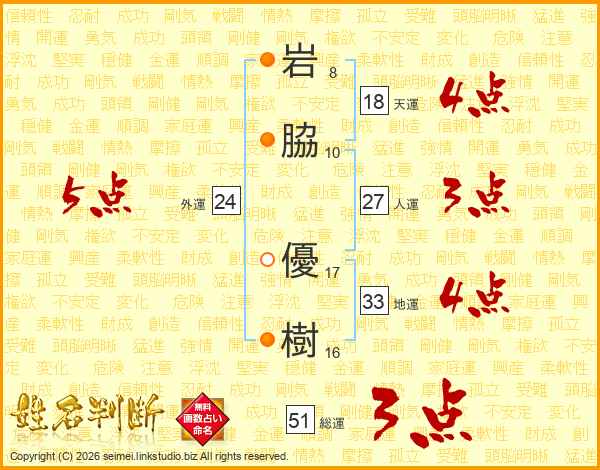 岩(8画)脇(10画) 優(17画)樹(16画)