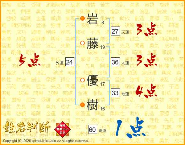 岩(8画)藤(19画) 優(17画)樹(16画)