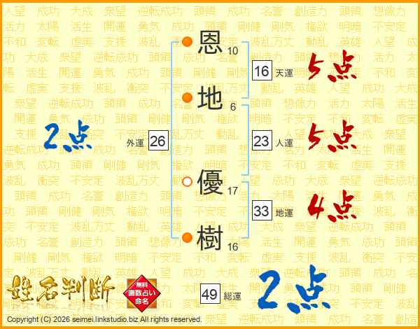 恩(10画)地(6画) 優(17画)樹(16画)