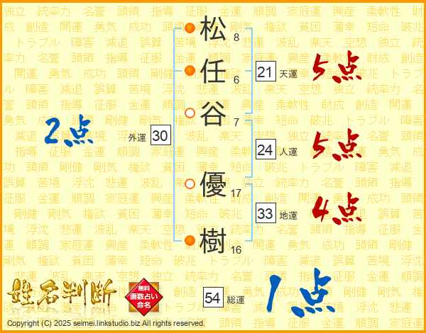 松(8画)任(6画)谷(7画) 優(17画)樹(16画)