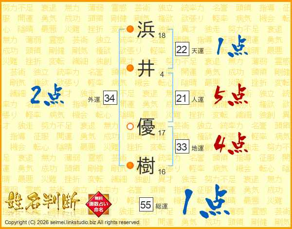 浜(18画)井(4画) 優(17画)樹(16画)