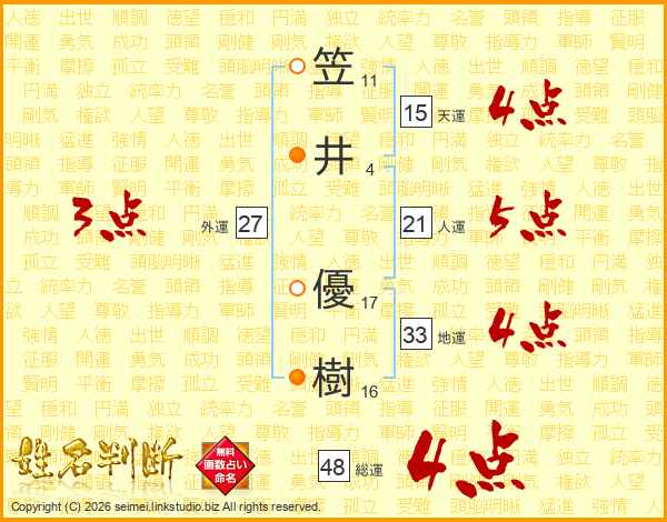 あなたの人生を表す1番重要な運勢です。生涯を通じて影響する総合運となり、主に50歳以降の晩年期に影響を及ぼします。苗字と名前の合計画数。